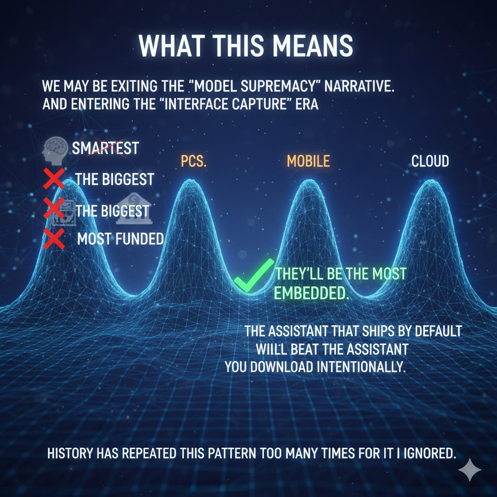 If models become interchangeable, the one with built-in distribution quietly eats the one with standalone brilliance.